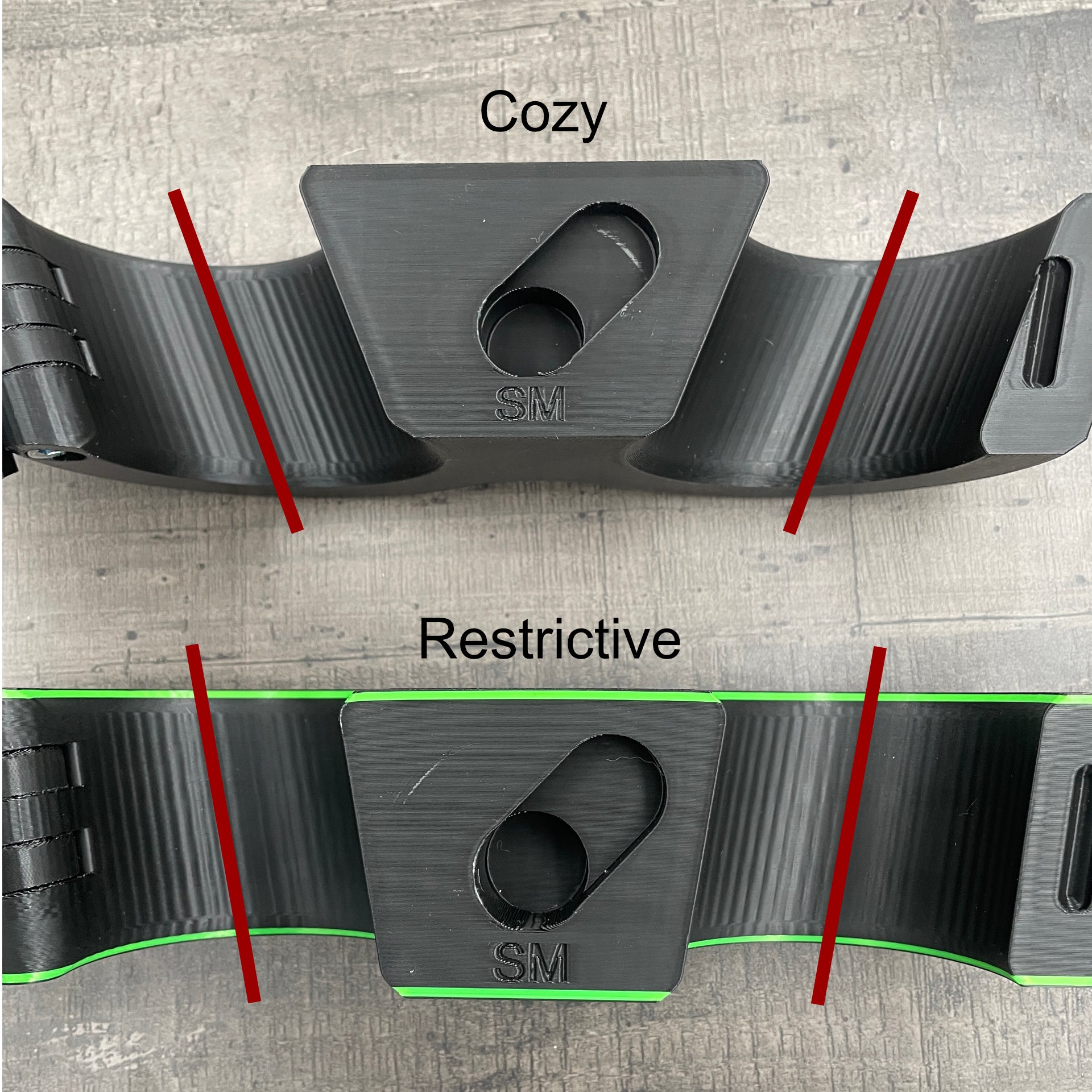 Die Manschetten sind in zwei verschiedenen Winkeln erhältlich: „Gemütlich“ und „Einschränkend“. Die Wahl der richtigen Option hängt größtenteils von den persönlichen Vorlieben ab. Manche Menschen bevorzugen Komfort, während andere eine restriktivere Erfahrung bevorzugen.